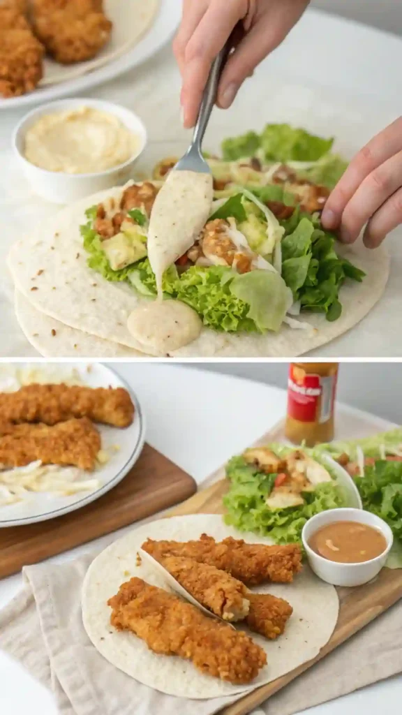 The contrast between crunchy chicken and soft tortilla makes every bite enjoyable, while the creamy dressing brings everything together.