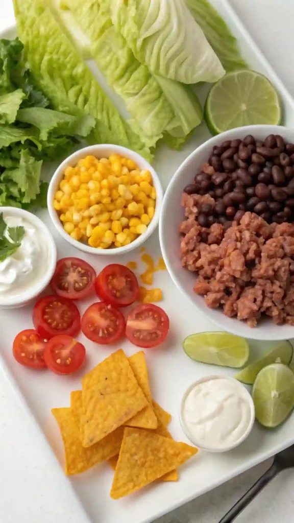 - In a large mixing bowl, combine the lettuce, tomatoes, corn, beans, shredded cheese, and cooked meat.