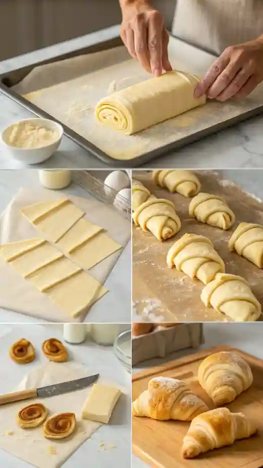 Roll dough into a large rectangle, cut into triangles, and roll each piece into a croissant shape.