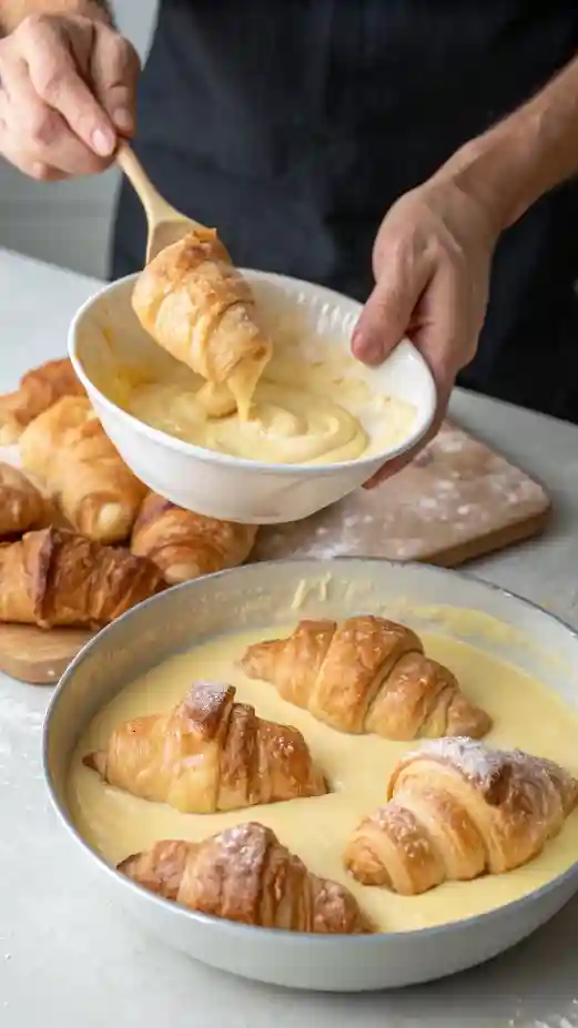 Soft croissants soaked in a sweet custard and baked until golden and fluffy.