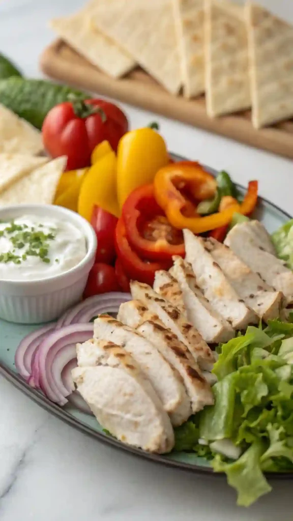 Fill pitas with chicken, vegetables, and toppings. Add yogurt sauce.